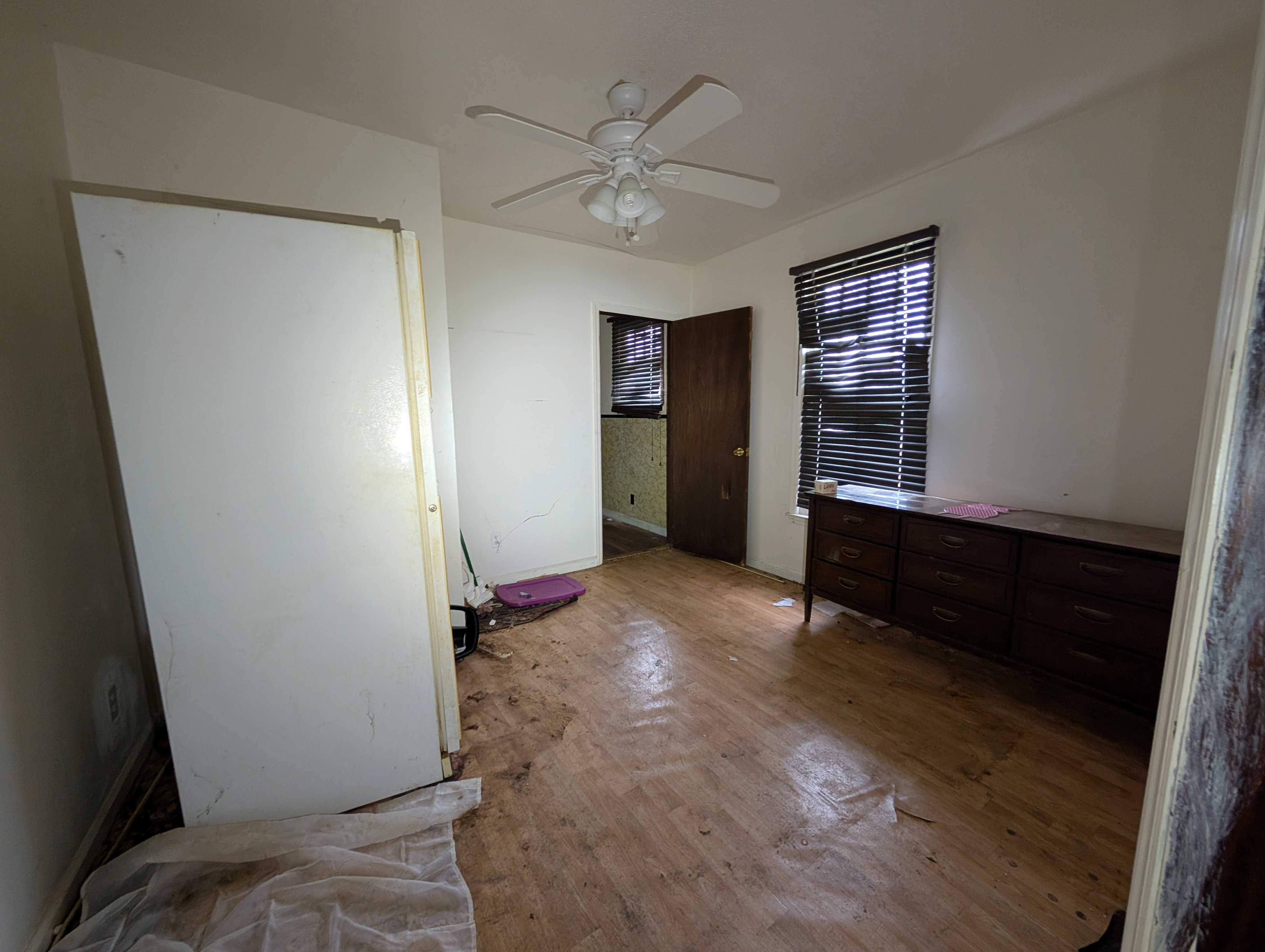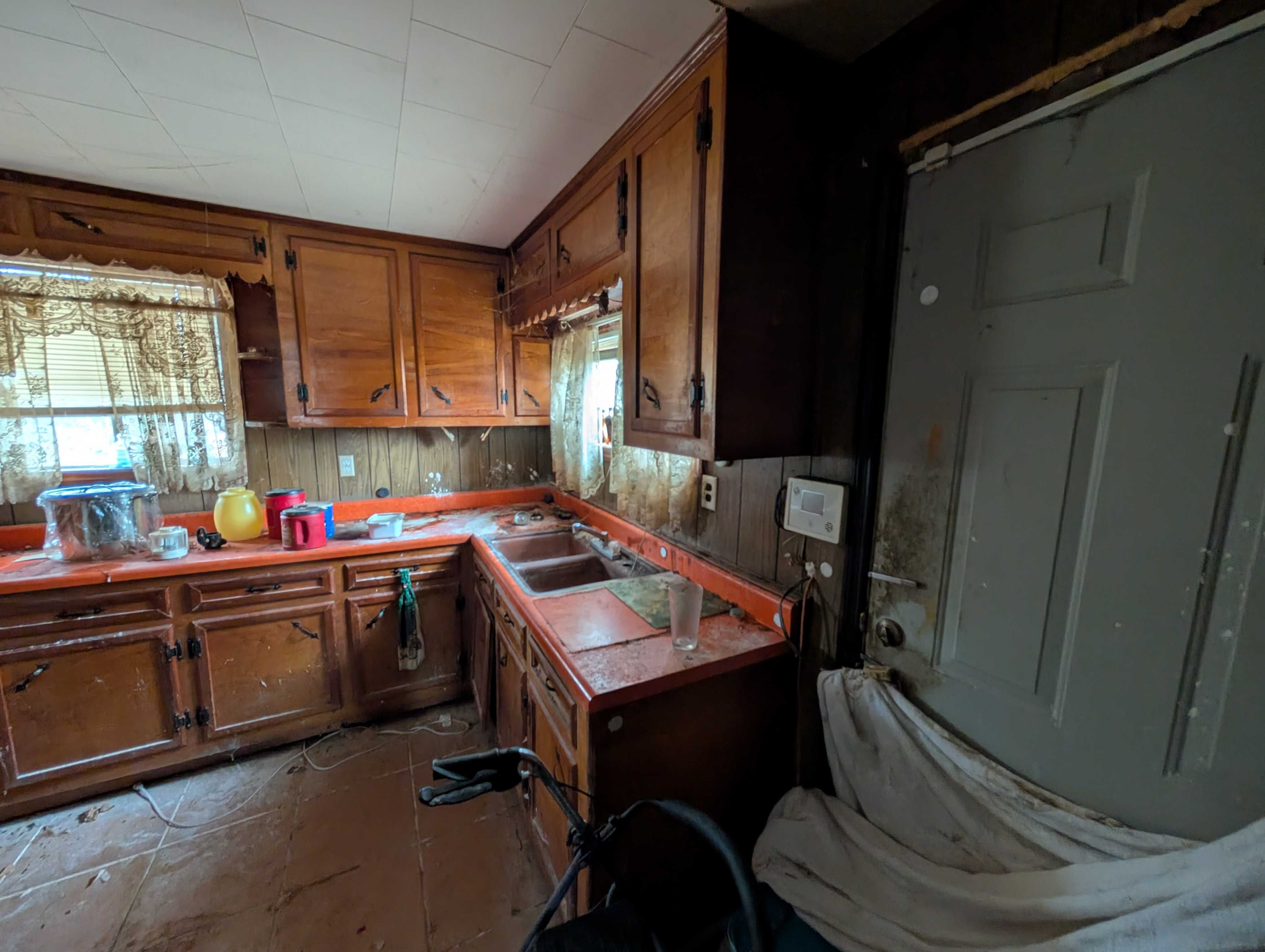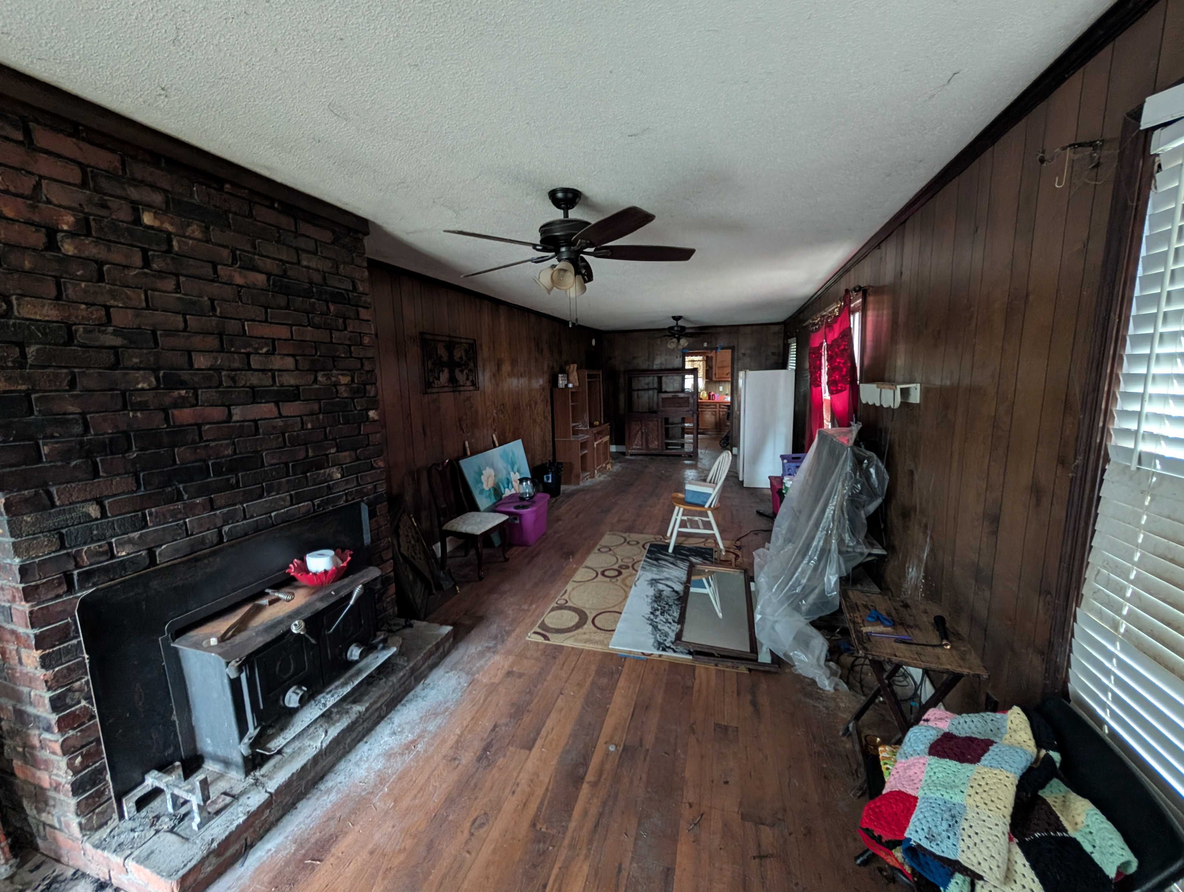 House has an appealing layout, with LOTS of living anc kitchen space down the right side. 3 bedrroms and (currently) one bathroom are on the left. But, room to easily modify that layout.